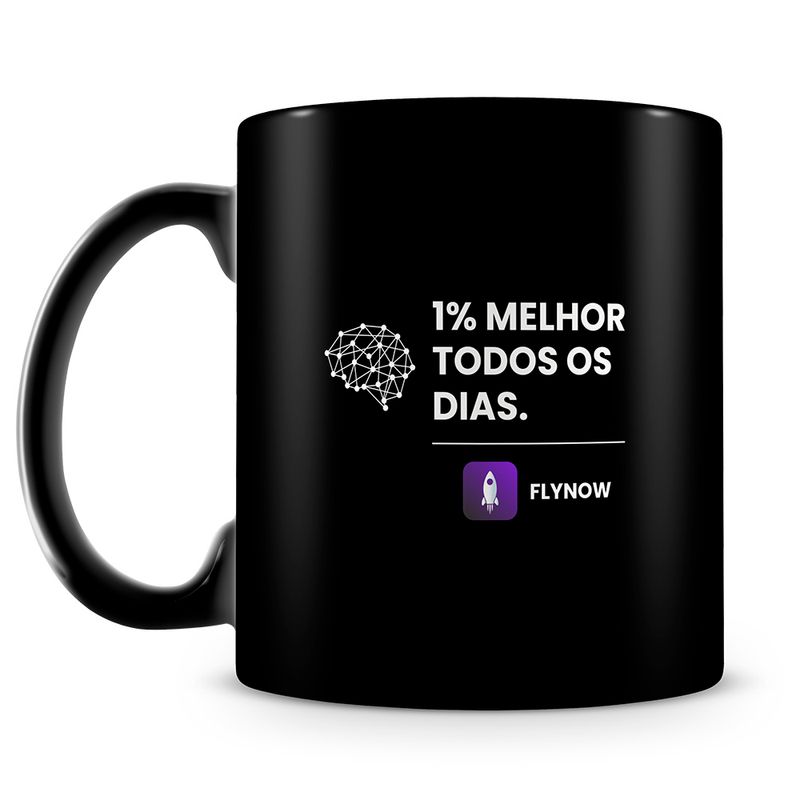 Caneca personalizada de porcelana de alto brilho, 100% preta, com estampa Flynow.
