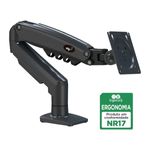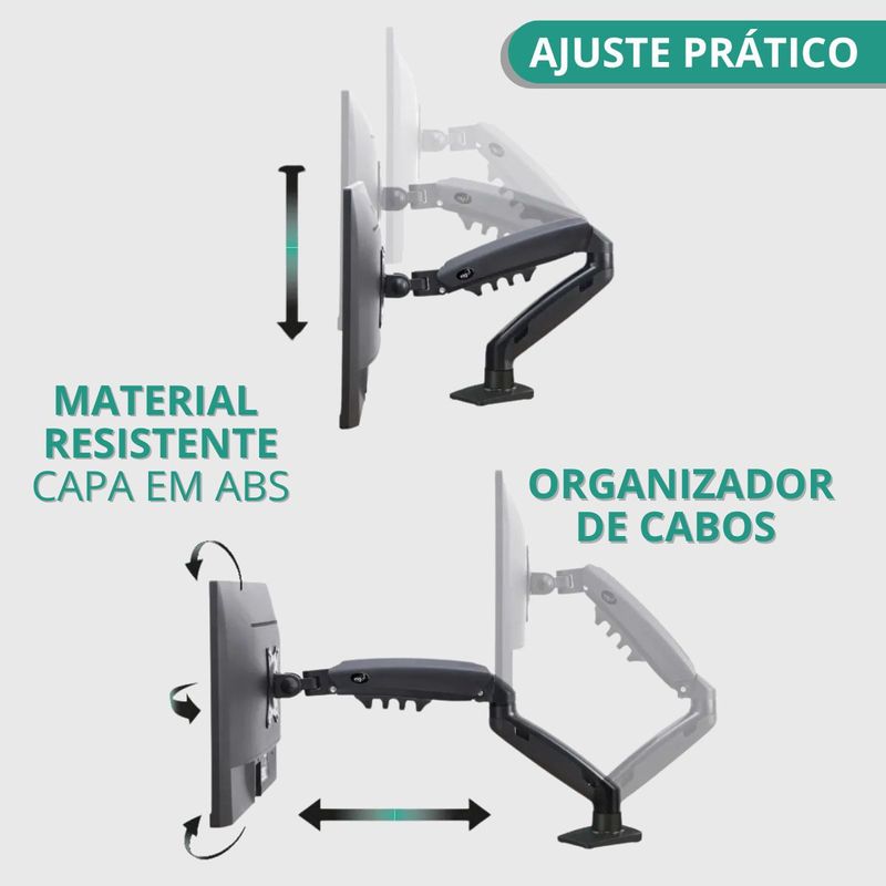 Atributos e benefícios: - Total flexibilidade para movimentos, sem esforço e sem a utilização de ferramentas; - Produto Ergonômico (Certificado NR17); - Design compacto e retrátil que economiza espaço; - Desenvolvido para melhorar sua experiência de visualização; - Construído em liga de alumínio fundido e super-resistente; - Acompanha morsa para fixação em borda de mesas ou sobre o tampo da mesa; - Organizador de cabos.