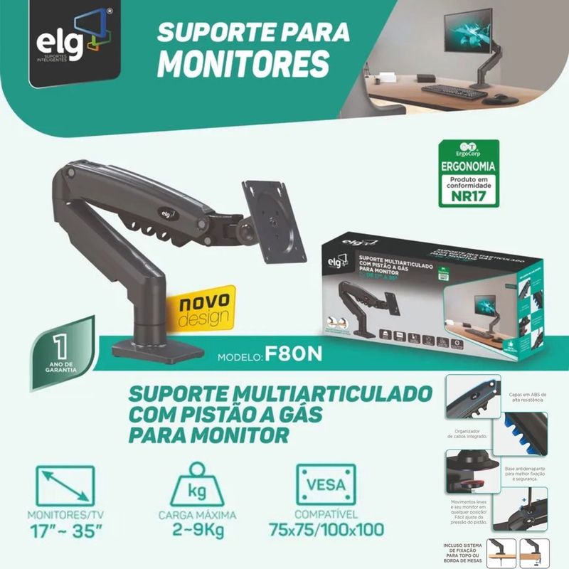 Conteúdo da Embalagem: 01 Suporte F80N ELG 01 Parafusos para fixação do monitor 01 Manual de instruções 01 Certificado de garantia.
